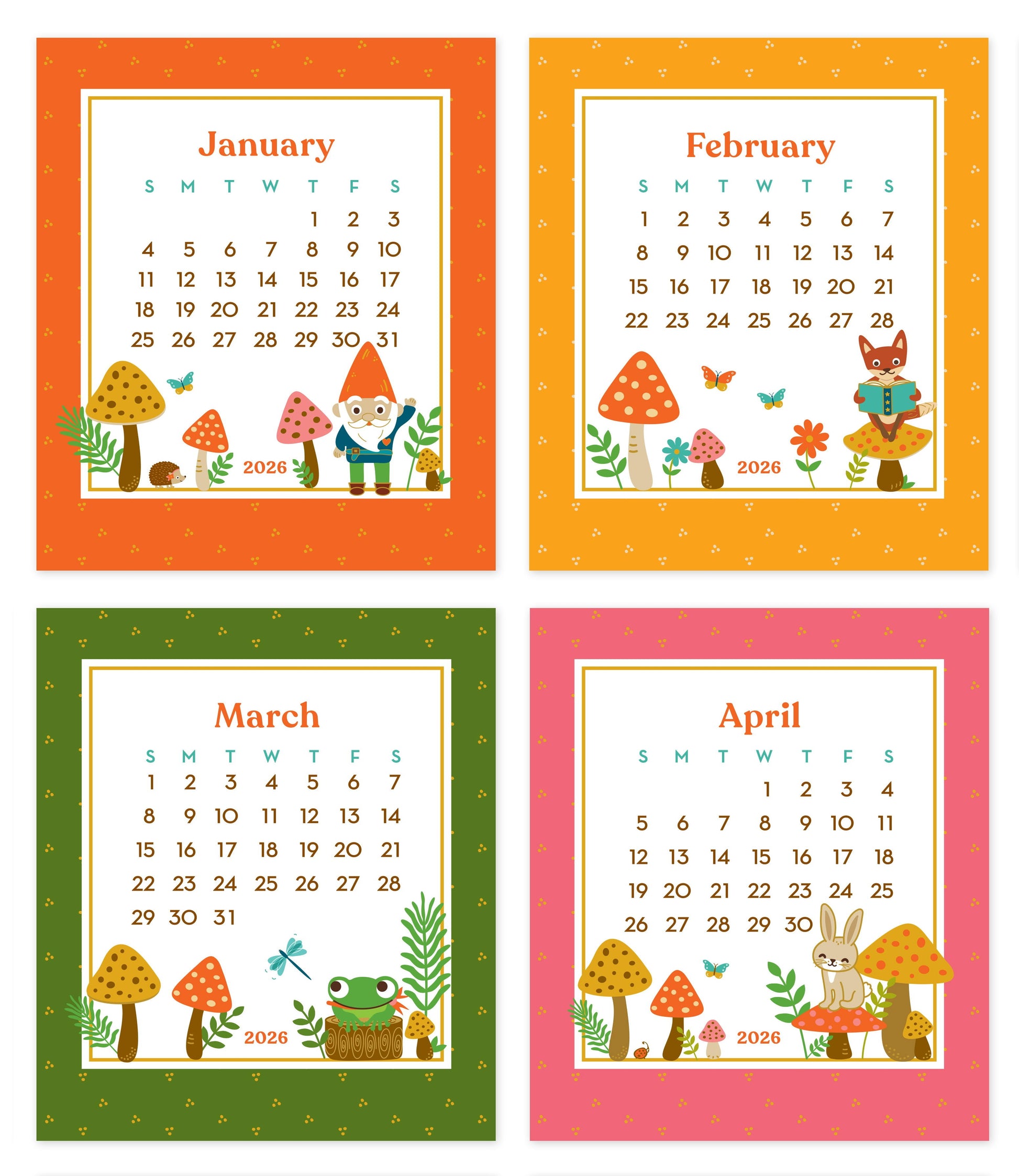 This 12-month desk calendar features joyful gnomes, vibrant mushrooms, colorful flowers and our beloved forest critters. The design extends to the back of each month and includes ruled lines for notes and to-dos, making it both charming and practical. A fun and thoughtful gift for a friend, teacher, or co-worker who loves whimsical animals and colorful designs and staying organized.