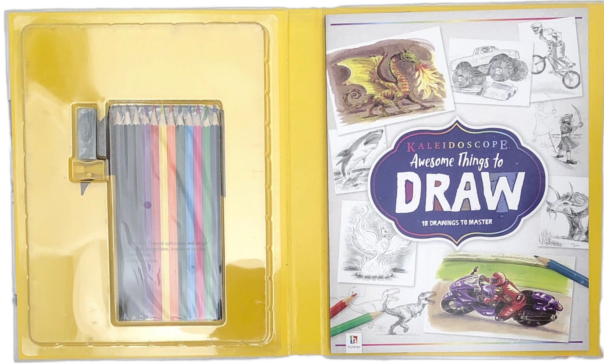Hinkler's Awesome Things to Draw is perfect for budding artists. Step-by-step instructions make it easy to learn over 18 drawing techniques, and the set includes all the tools you'll need to get started. 9 colored pencils, 3 grey pencils, a putty eraser, and a pencil sharpener provide plenty of materials to experiment. The accompanying 64-page book provides additional guidance.