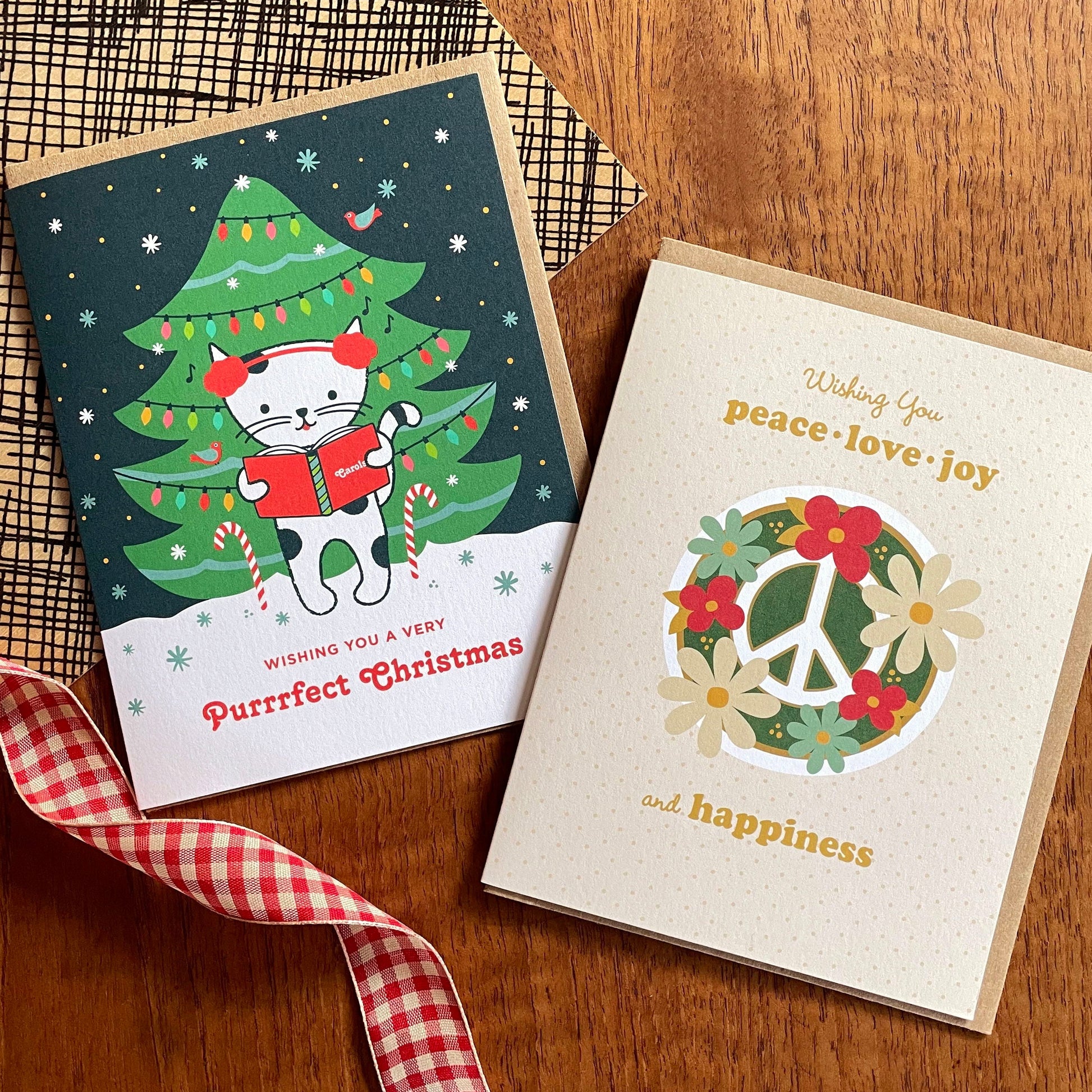Available as a single card or a boxed set of 10, each folded card features a peace sign surrounded by festive florals on a soft cream background, with the message “Wishing You Peace, Love, Joy and Happiness.” Blank inside and printed on FSC-certified, eco-friendly paper, these whimsical holiday cards are perfect for sending warm, heartfelt greetings to loved ones and colleagues this season.