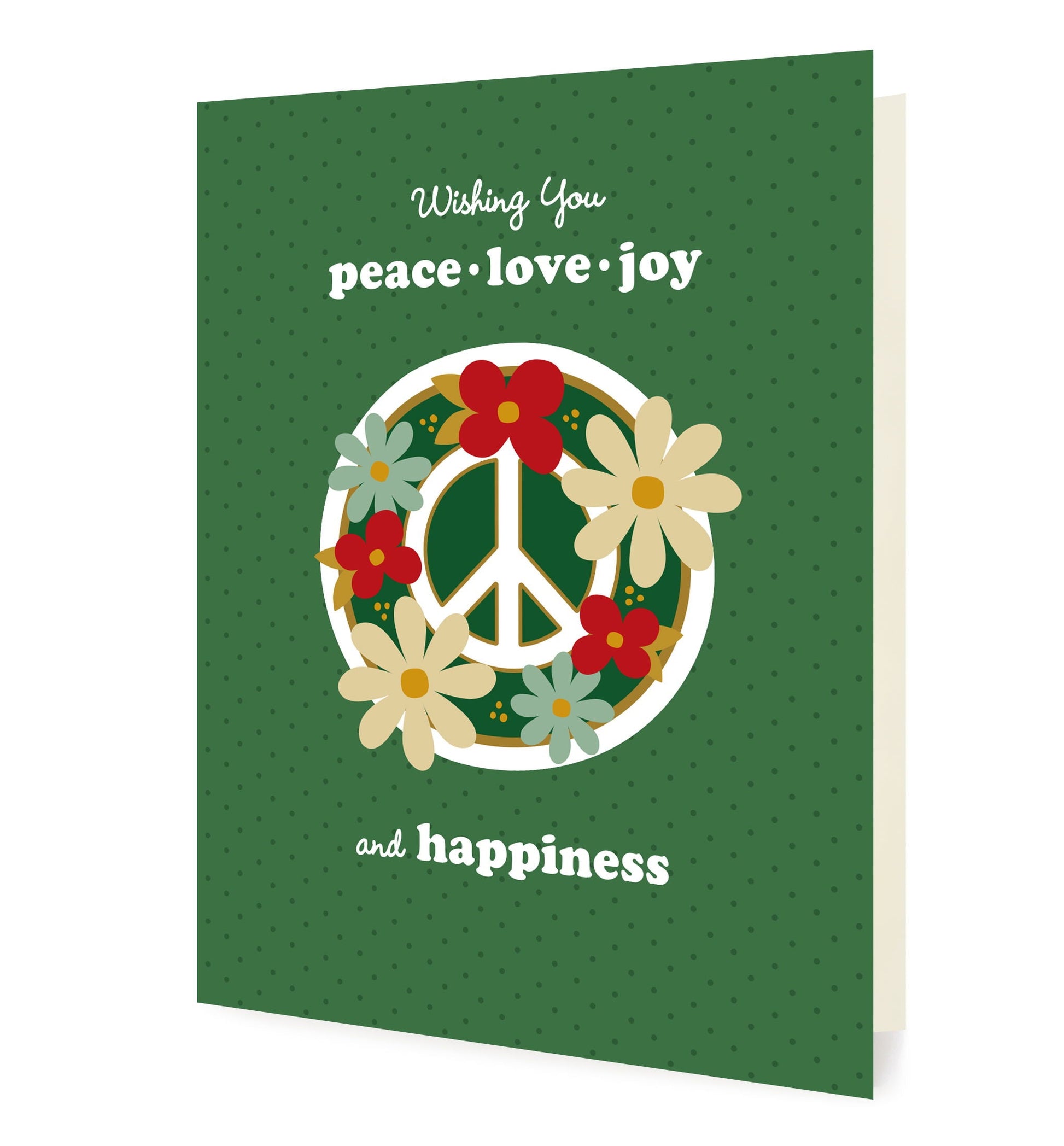 Available as a single card or a boxed set of 10, each folded card features a green background with a cheerful peace sign surrounded by festive florals and the message “Wishing You Peace, Love, Joy and Happiness.” Blank inside and printed on FSC-certified, eco-friendly paper, these charming holiday cards are perfect for sharing festive greetings with family, friends or colleagues who appreciate a joyful, heartfelt holiday message.