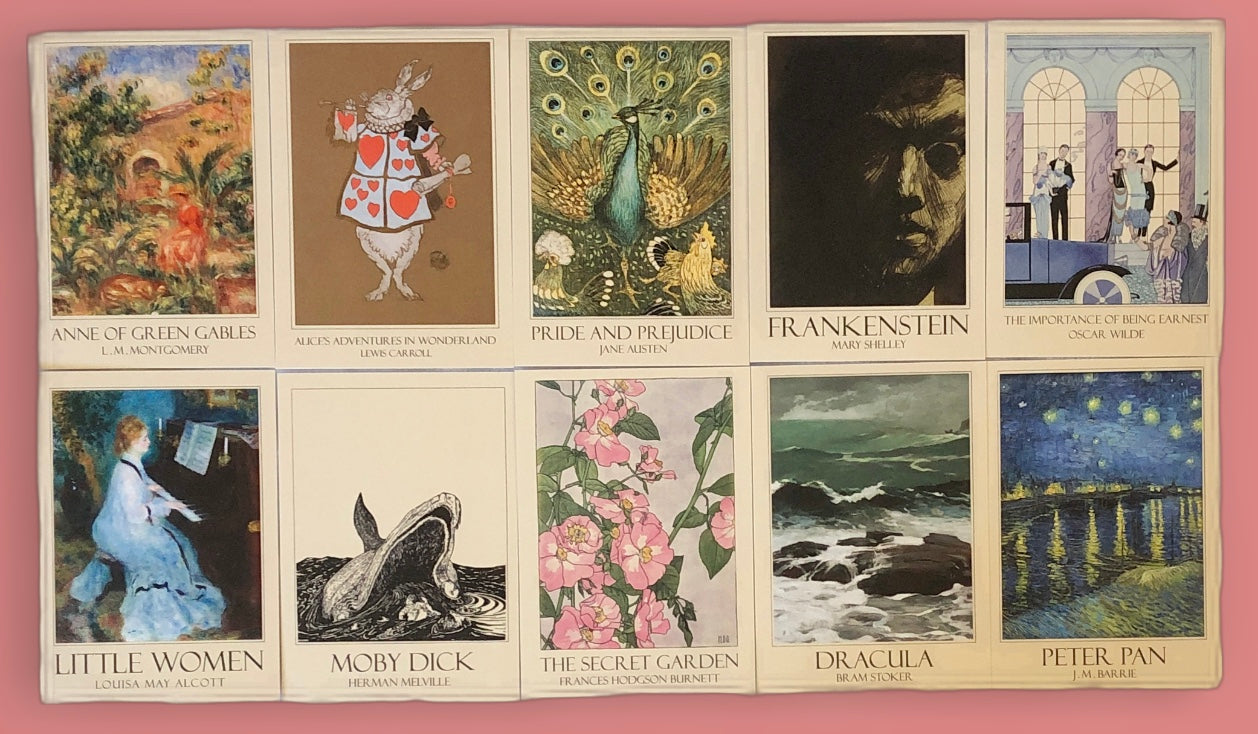 This set of 10 postcards features ten different literary book covers in a classic art style. A6 in size with the back of each card set out to a standard postcard design. Made with 300gsm white textured stock. Set includes: Pride and Prejudice, The Secret Garden, Peter Pan, Moby Dick, Little Women, The Importance of Being Earnest, Frankenstein, Dracula, Anne of Green Gables, Alice's Adventures in Wonderland