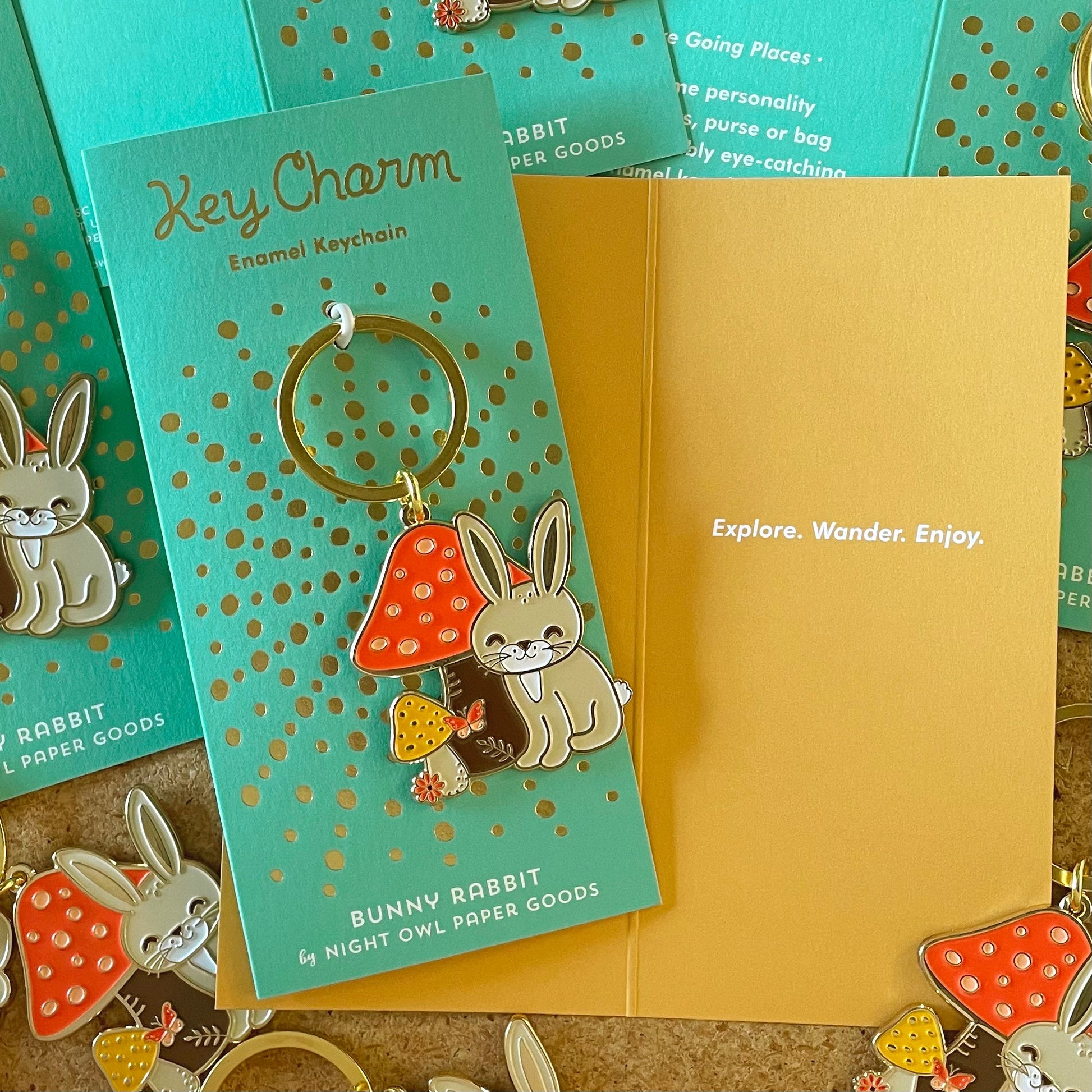 This joyful bunny keychain adds woodland charm to keys, purses and bags. Our content little rabbit, nestled among mushrooms, brings cozy forest vibes and cheerful charm wherever it goes. Perfect for animal lovers, students, friends and anyone who enjoys whimsical, storybook-inspired flair. A delightful gift for birthdays, holidays, Easter or just because.