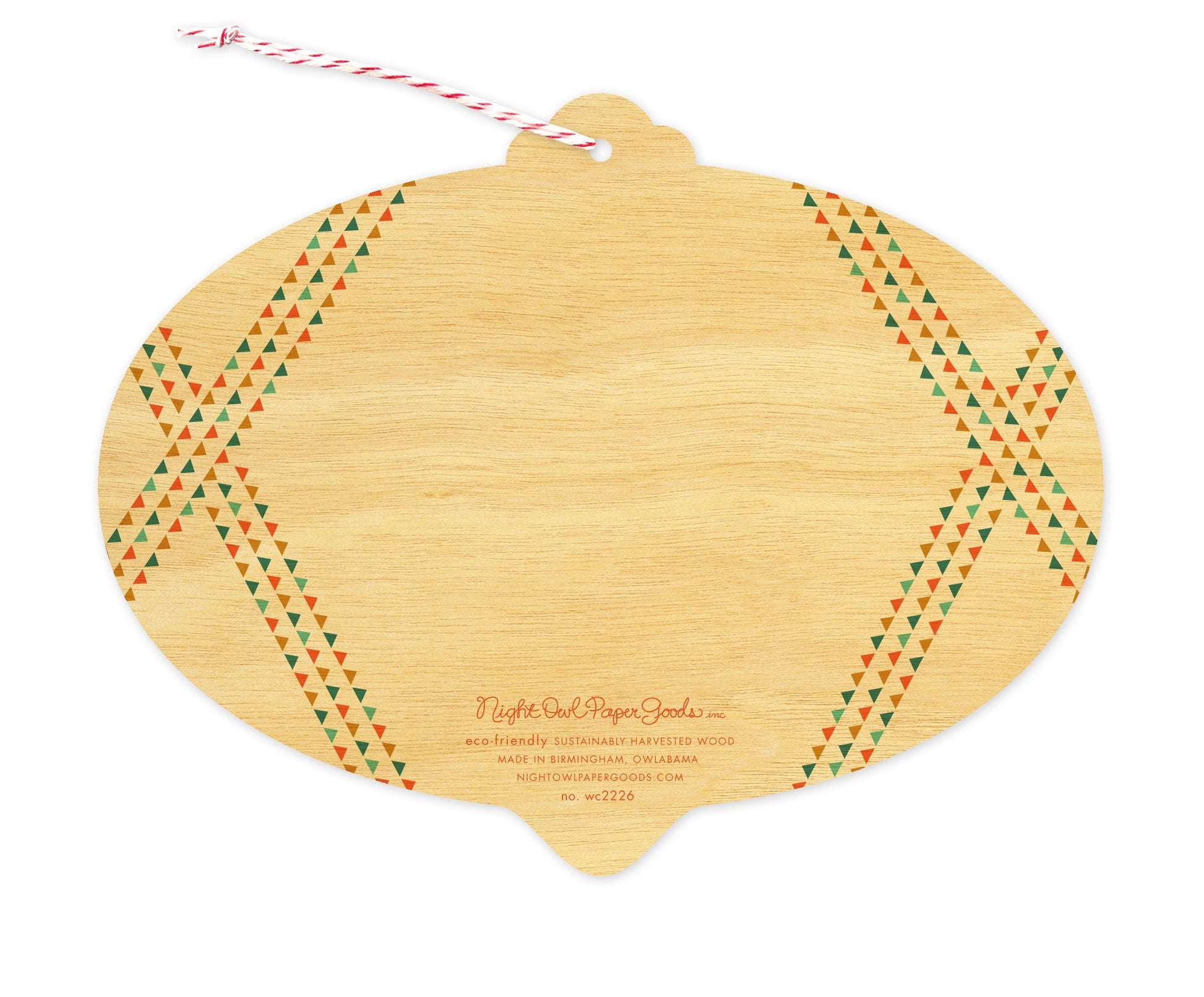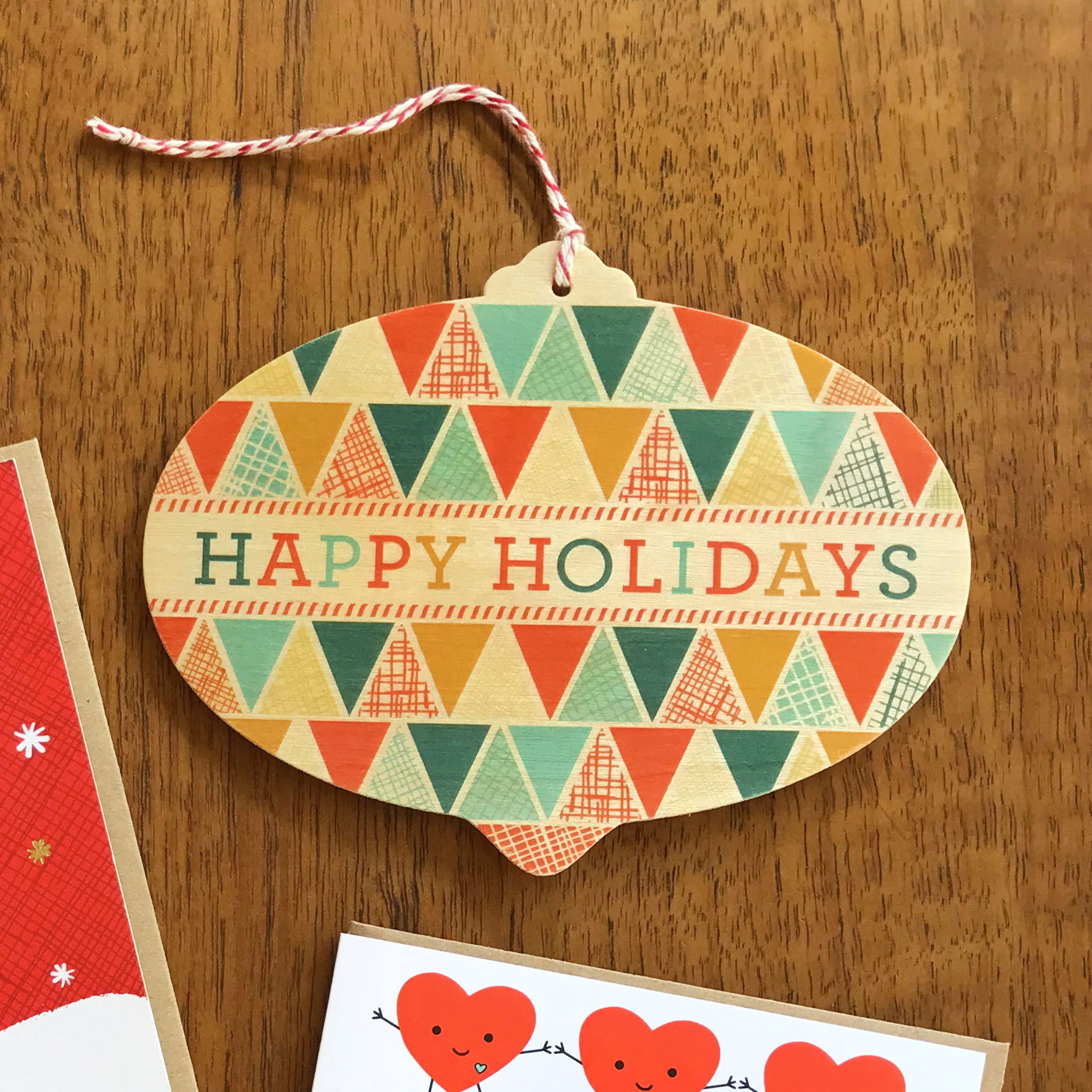 Share holiday cheer with this ornament card that features a colorful patchwork patterned bulb design and a cheerful “Happy Holidays” message. Unlike traditional paper cards, this ornament card is crafted from sustainably harvested birch wood, making it one-of-a-kind. It's a cheerful holiday greeting that lasts beyond the season, perfect for family, friends, colleagues or anyone who enjoys joyful, artsy designs.
