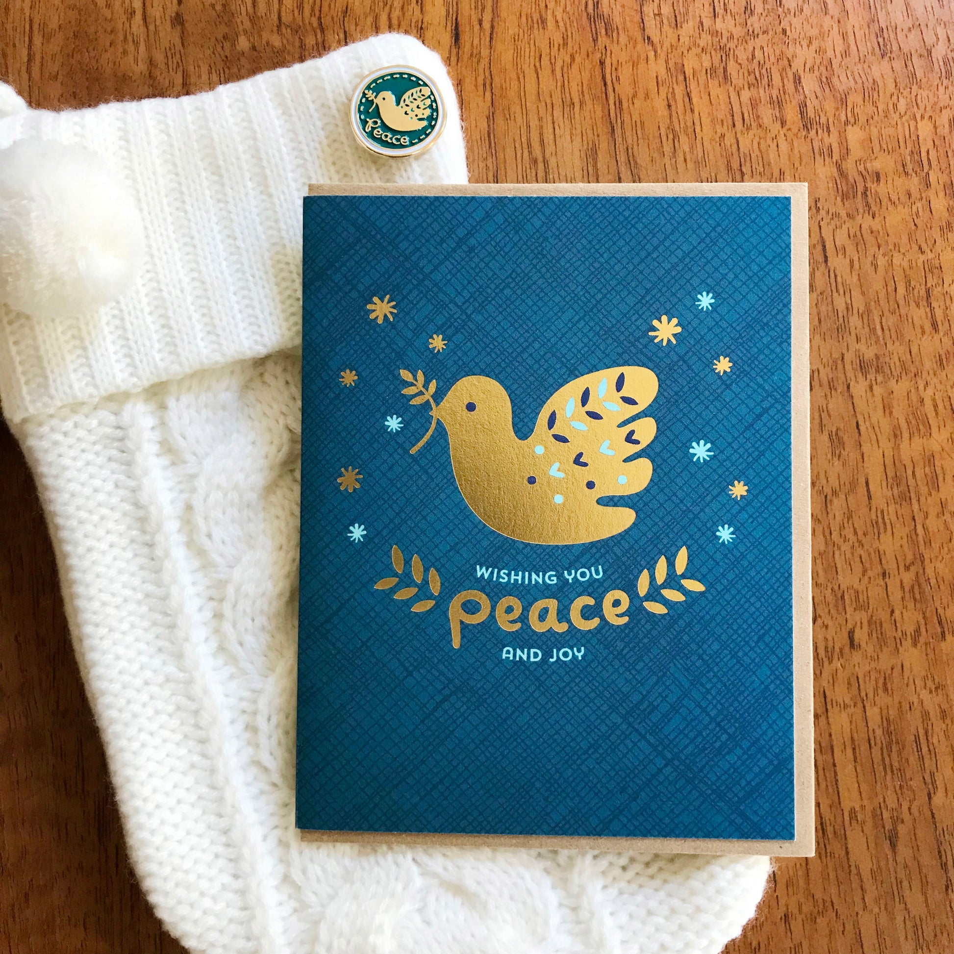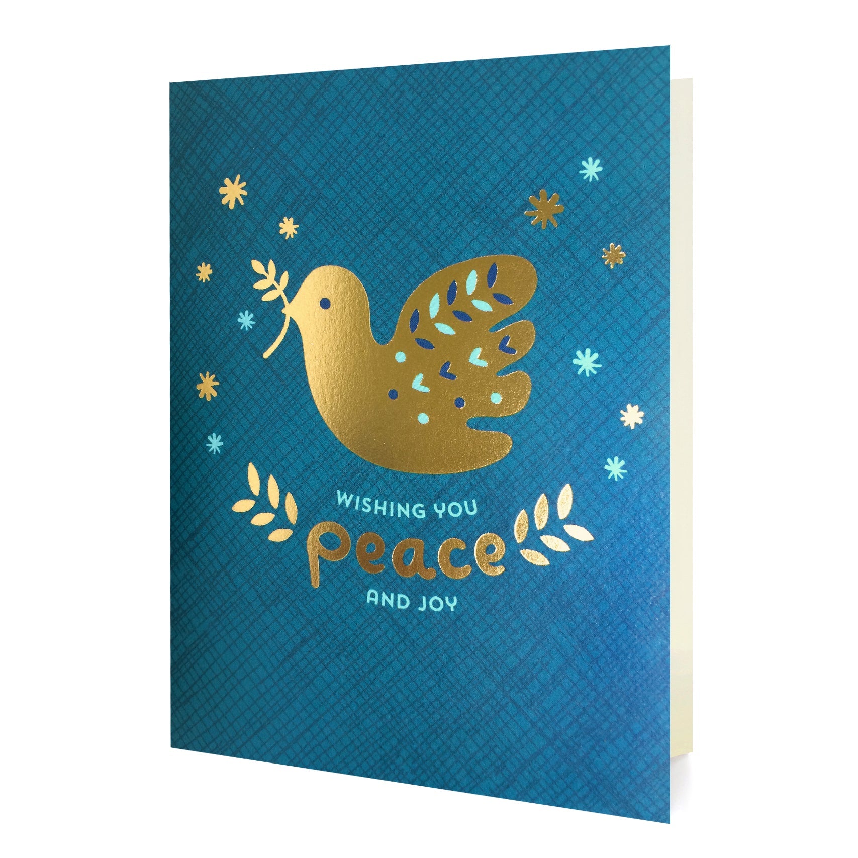 Available as a single card or a boxed set of 8, each folded card features a beautiful shiny gold dove and the message “Wishing You Peace & Joy” on a rich blue background. Blank inside and ready for your personal holiday greeting, these eco-friendly cards are perfect for sending joy to family, friends and colleagues.