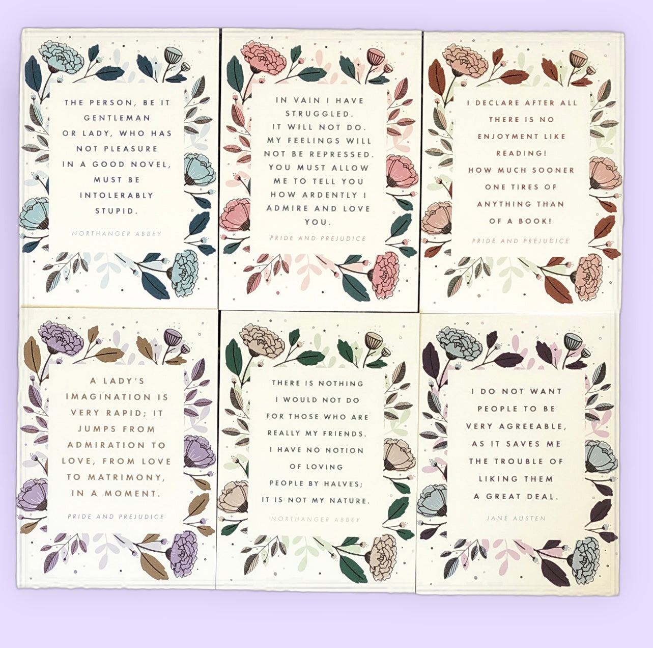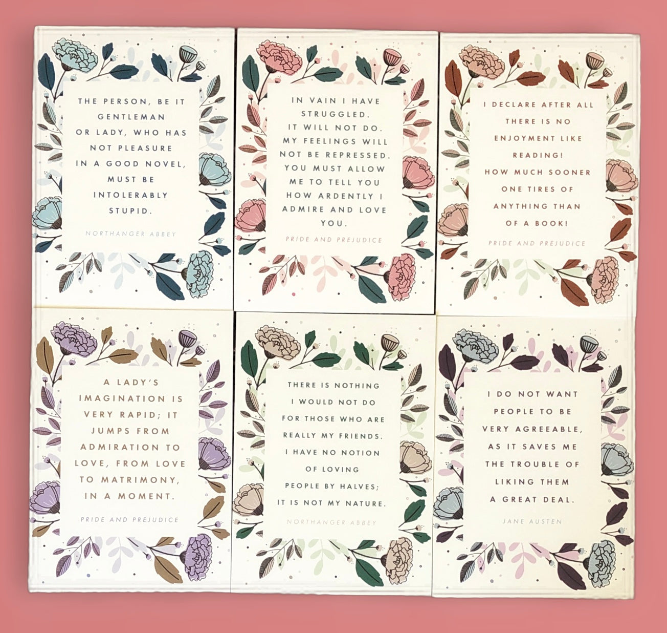 Delight fans of Jane Austen with this set of 6 postcards featuring her timeless quotes. Printed on 300gsm white textured stock, each postcard includes a standard postcard design on the back and measures A6 in size. Perfect for giving to a friend or for framing and displaying.