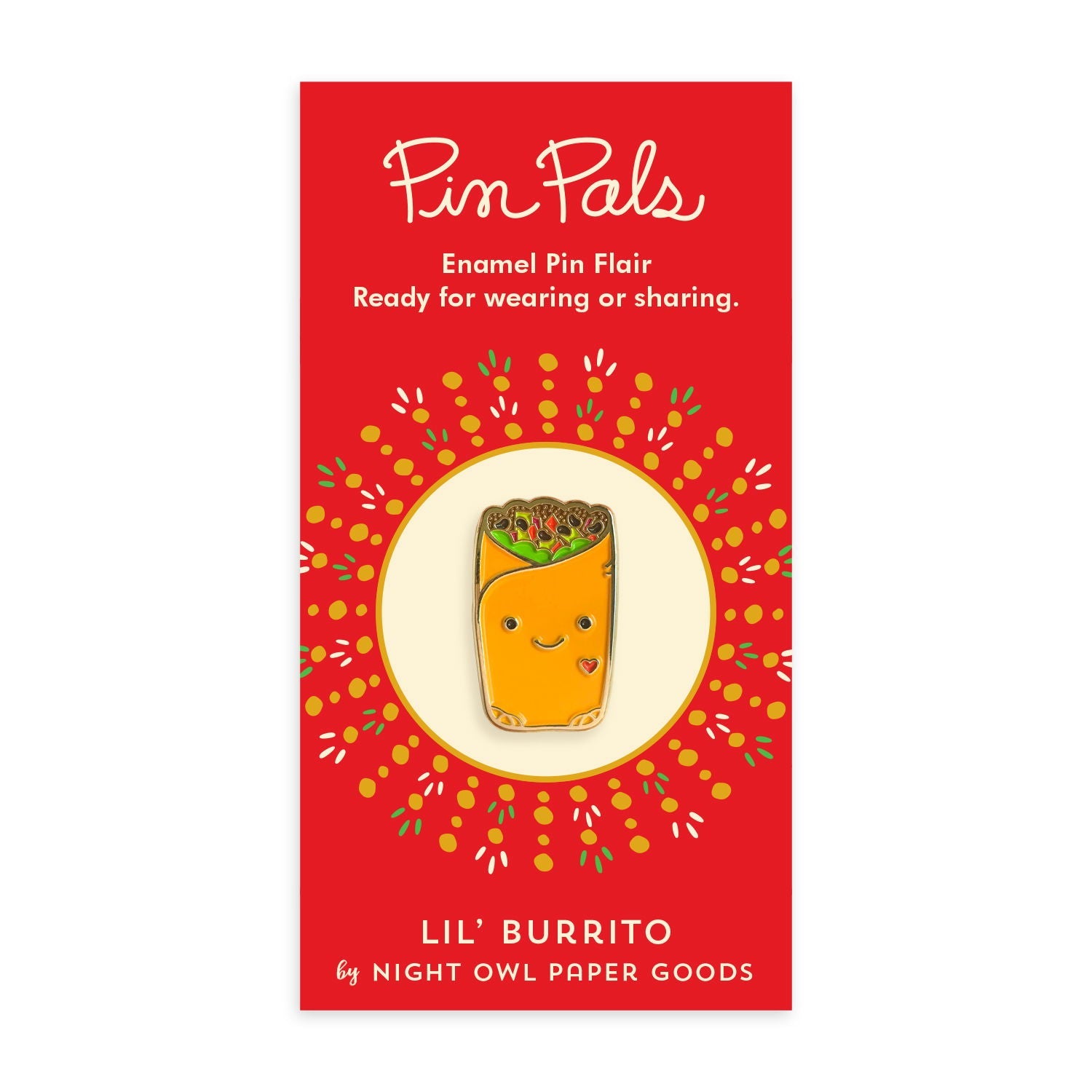 This cheerful Lil’ Burrito enamel pin adds a pop of foodie charm to jackets, bags and backpacks. With its smiling face and colorful details, it’s a playful way to show off your love for Mexican cuisine and fun accessories. Perfect for burrito lovers, pin collectors and anyone who loves quirky, ready-to-wear foodie flair. A delightful gift for birthdays, holidays, Taco Tuesday, Cinco de Mayo or just because.