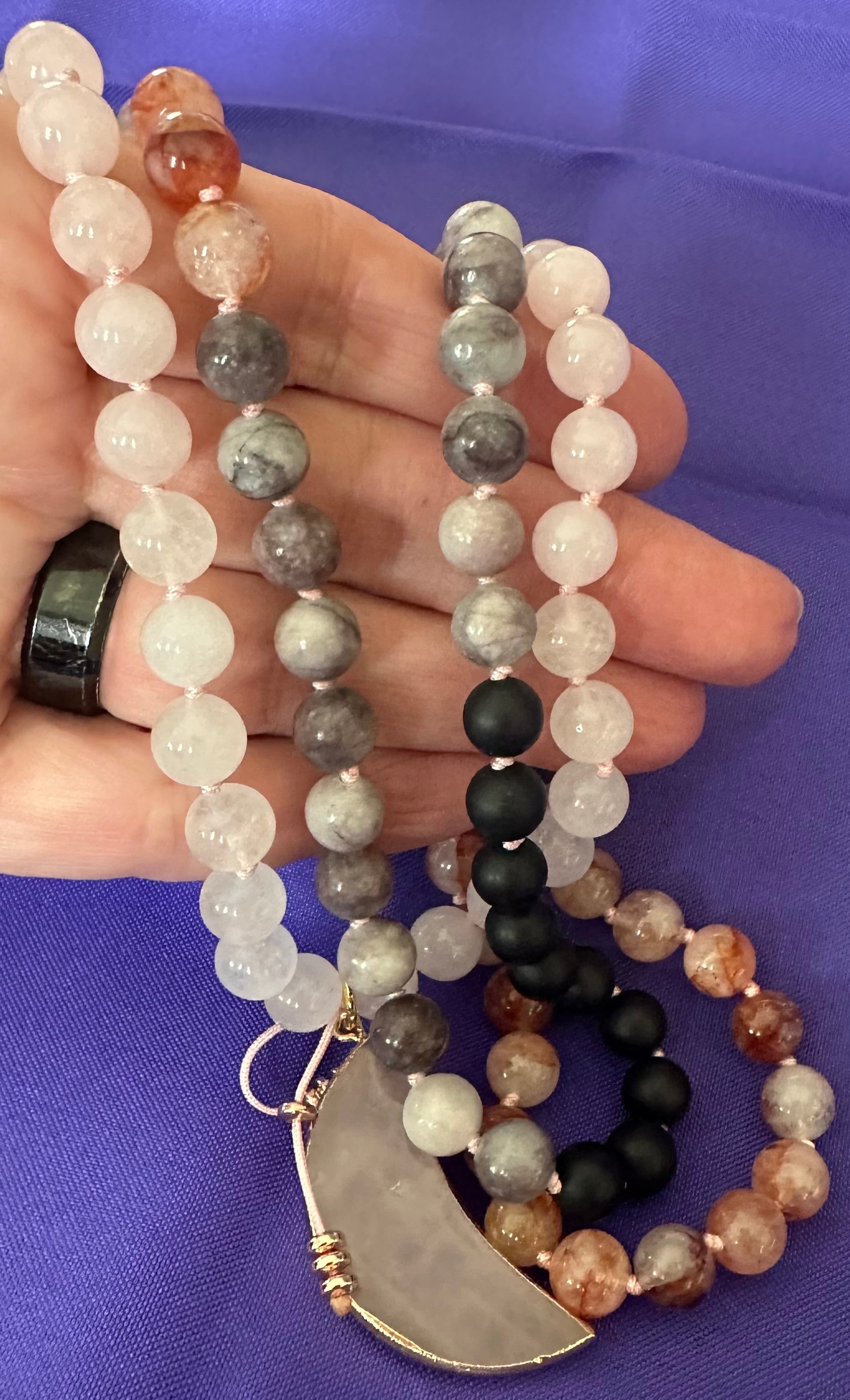 Handcrafted with 108 beads of natural Rose Quartz, Black Onyx, Fire Quartz, White Stone, and Purple Stone, this mala necklace promotes love and protection. Featuring a Rose Quartz moon pendant, it enhances emotional healing and compassion. Rose Quartz fosters love, Black Onyx provides grounding and protection, Fire Quartz energizes, White Stone supports clarity, and Purple Stone aids spiritual growth. Perfect for daily wear or meditation, this necklace measures around 91cm. Key Features: 108 beads Natural 8mm Rose Quartz, Black Onyx, Fire Quartz, White Stone, and Purple Stone Rose Quartz moon pendant Around 91cm length Hand-knotted for durability