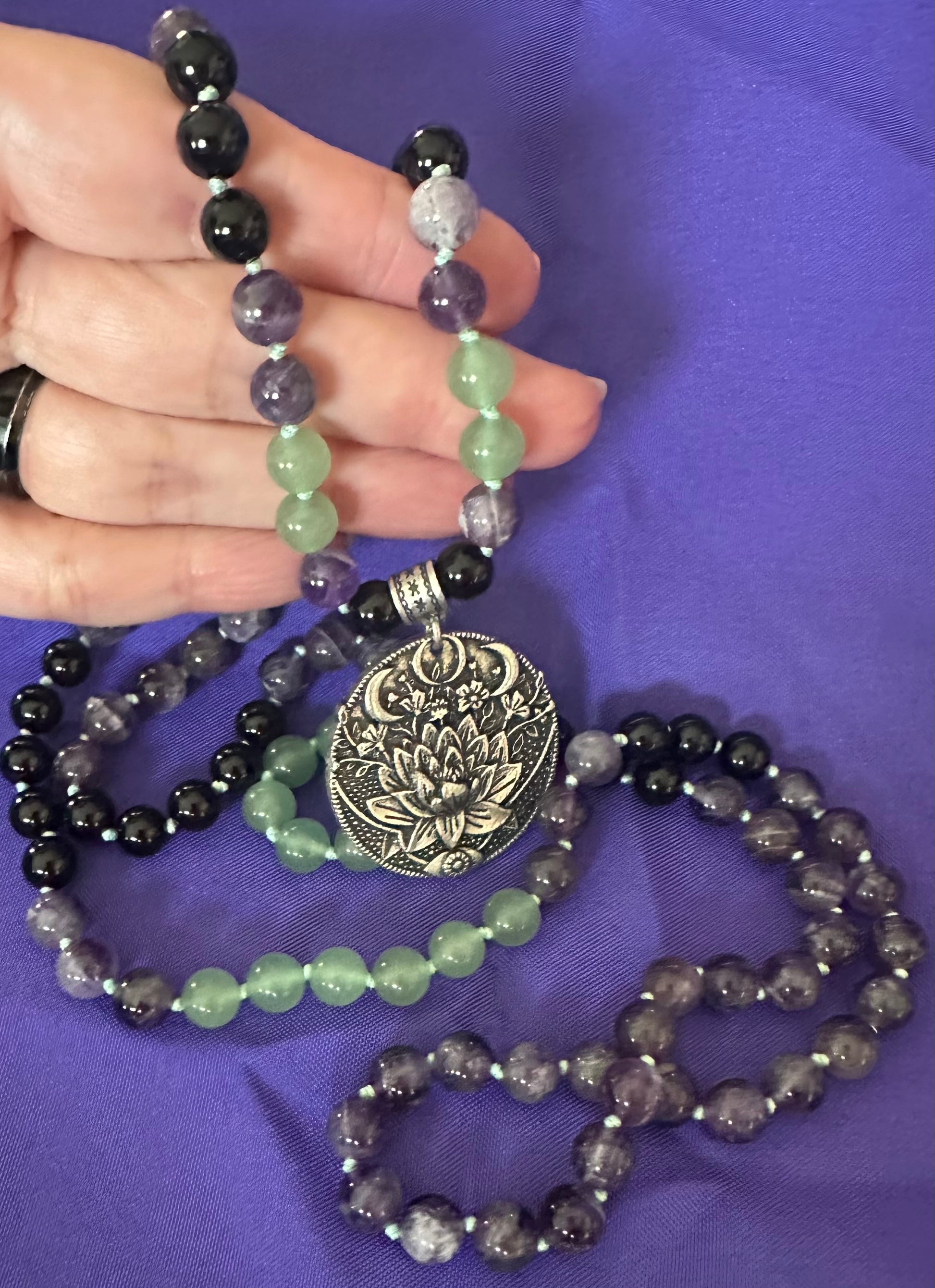 Discover abundance and protection with our elegant 108 Mala Bead Necklace, thoughtfully crafted from Green Aventurine, Amethyst, and Black Onyx gemstone beads, complete with a stunning spiritual pendant. This mala bead necklace is not only a tool for meditation but also a symbol of balance, clarity, and spiritual empowerment. Genuine Green Aventurine, Amethyst, and Black Onyx Beads: Handcrafted with authentic 8mm gemstone beads that radiate natural energy and beauty. Spiritual Pendant: The centerpiece pendant adds a meaningful touch, symbolizing guidance, resilience, and spiritual strength. 108 Beads Design: Traditional 108 mala beads to support meditation, mantra chanting, and mindfulness practices.