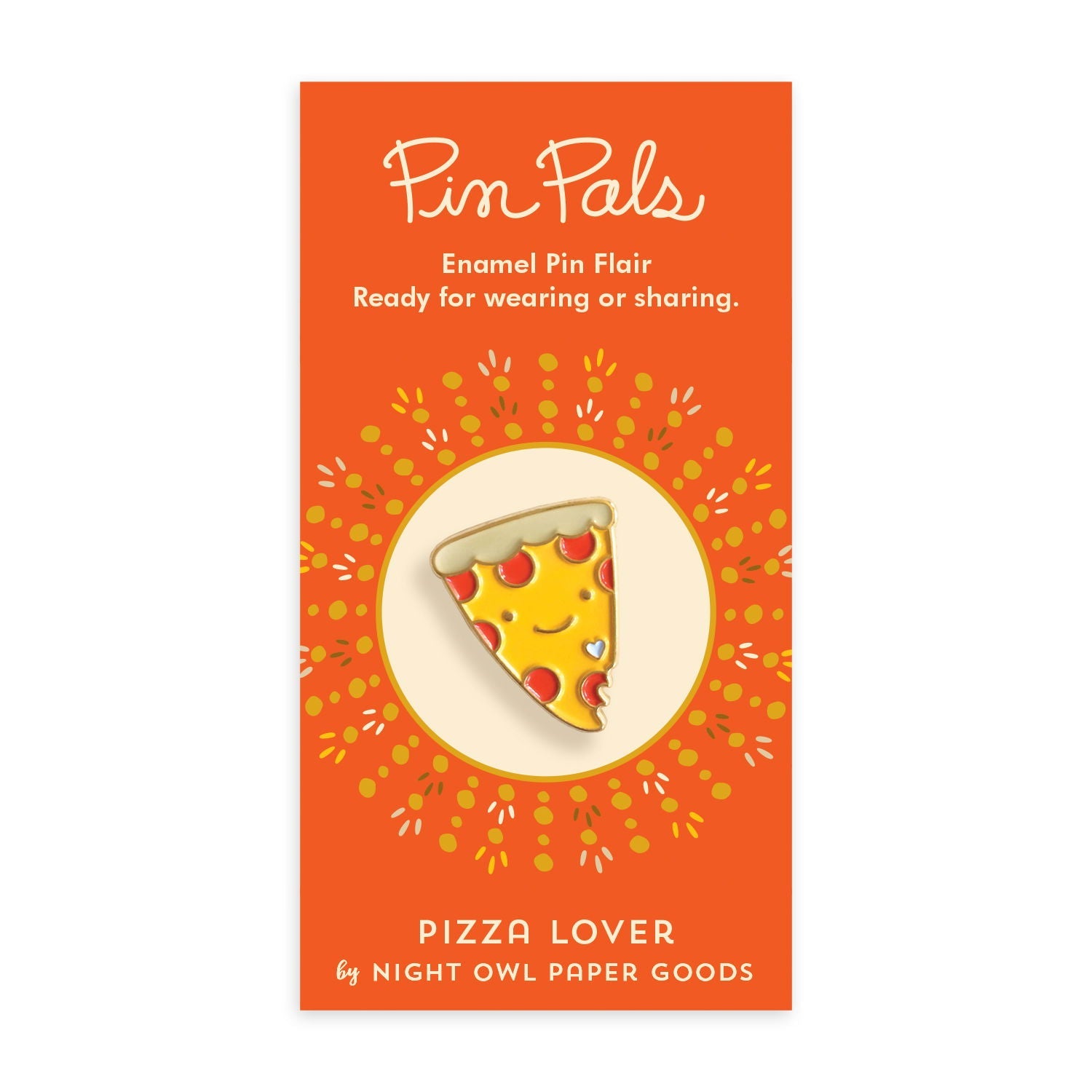 This smiling pepperoni pizza enamel pin serves up cheesy charm on jackets, bags, work aprons and hats. A fun way to show your foodie flair and celebrate your favorite comfort food. A playful gift for birthdays, holidays and pizza parties galore.