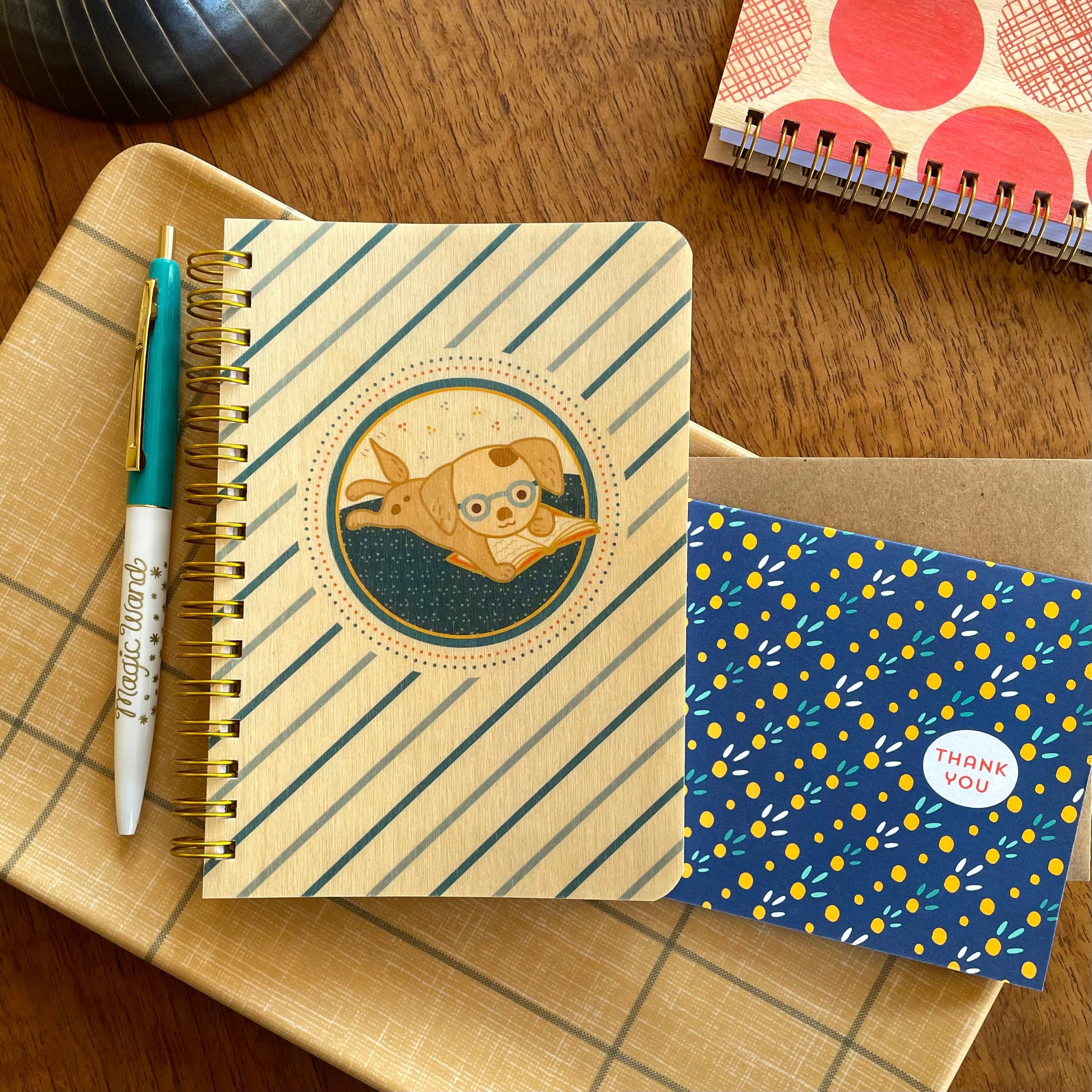 This pocket-size notebook features flexible wood covers made from sustainably harvested real birch, adorned with an adorable reading puppy dog bordered by blue stripes. Handcrafted with care and easy to carry along on your next writing adventure, it’s a fun, practical gift for readers, dog lovers, note-takers and anyone who loves to jot down favorite thoughts and ideas.
