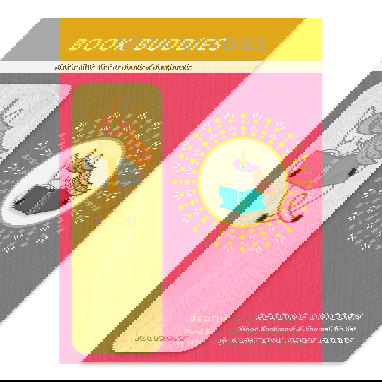 Reading Unicorn Book Buddies Wood Mini Bookmark + Pin Gift Set