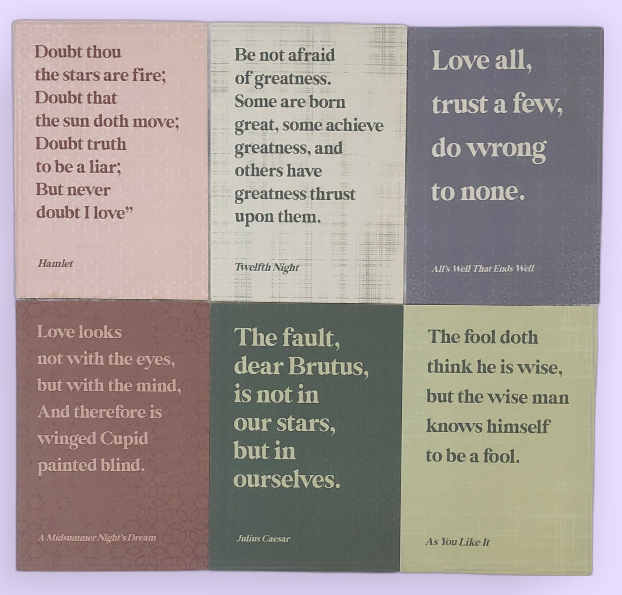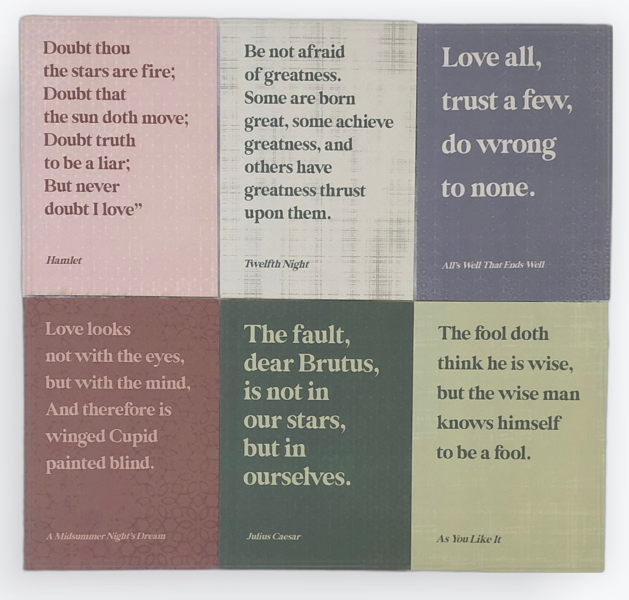 This set of postcards features 6 inspirational quotes from William Shakespeare. Each card is A6 in size and made with 300gsm white textured stock for a quality feel. The standard postcard design on each back makes writing a quick and easy.